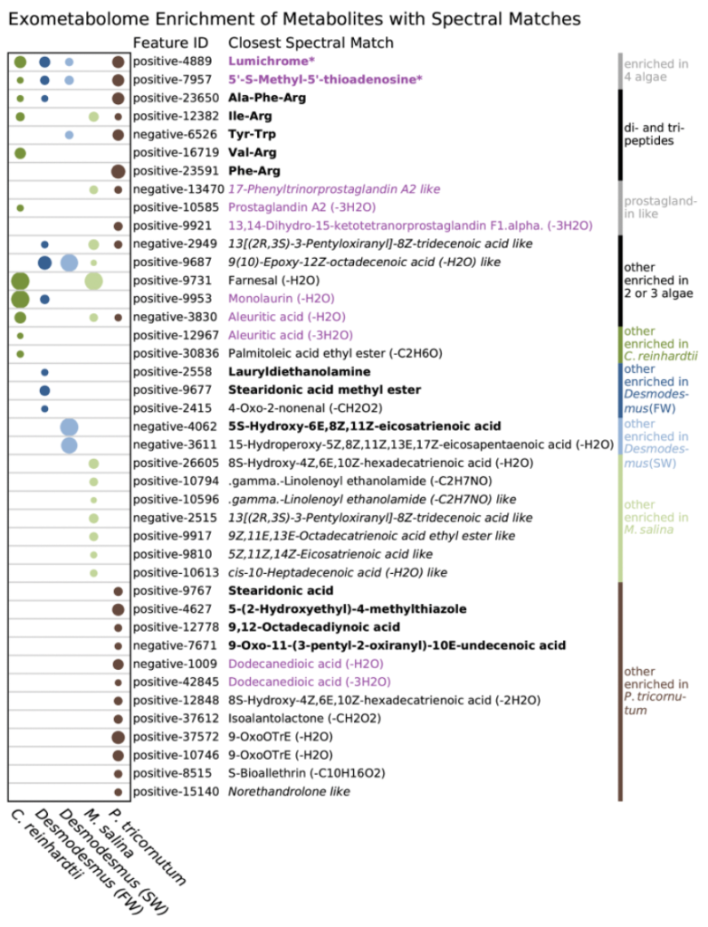Feature-based molecular networking revealed the algae were producing di- and tripeptides, lumichrome, and prostaglandin-like molecules. Five of the compounds identified (lumichrome, 5′-S-methyl-5′-thioadenosine, 17-phenyl trinor prostaglandin A2, dodecanedioic acid, and aleuritic acid) had an impact on algal growth when added to cultures, as measured by chlorophyll production. To learn more about these interactions and check out the full results, read the original paper.
